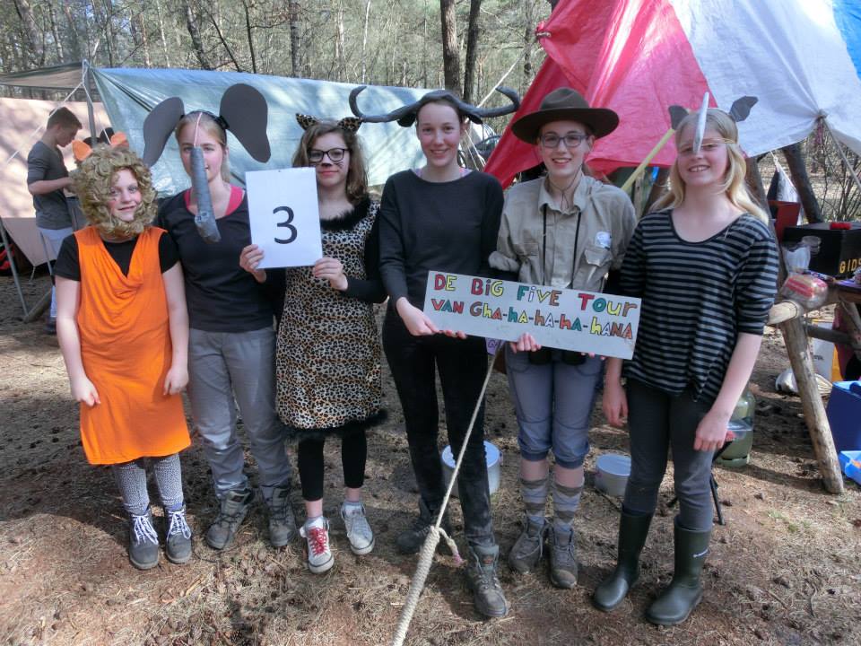 Toen we klaar waren met opbouwen hebben we de tent ingedeelde en werd er gefloten. Dat betekende dat we moesten verzamelen en werd er uitgelegd wat er verder gebeuren zou. Na de uitleg moesten we onze themakleding aan doen en gingen we naar de kampvuurkuil. Wij gingen als laatste subkamp omdat we het minst ver moesten lopen. Eenmaal aangekomen werd er een toneelstukje gespeeld en tijdens het optreden werd er een liedje afgespeeld en dat was WakaWaka.