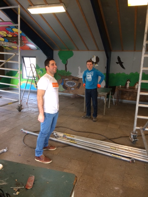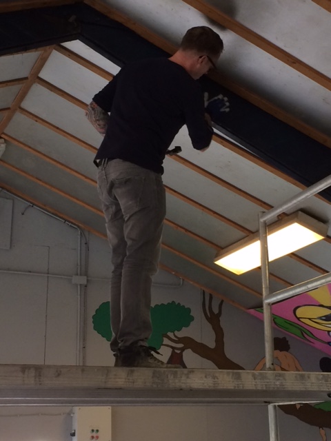 Afgelopen jaren zijn we druk bezig geweest met de grote zaal. De muurschilderingen zijn nu afgerond en de grote zaal heeft een nieuw en fris uiterlijk gekregen. In april wordt de tegelvloer vervangen door een egale betonvloer. Daarom zijn we bezig gegaan met het afronden van het laatste beetje schilderwerk. We hebben de kozijnen opnieuw geschilderd, en de spanten een nieuwe lik verf gegeven, waardoor alles er weer netjes uit ziet en na de aanleg van de beton vloer is het opknappen van de grote zaal dan ook helemaal klaar.